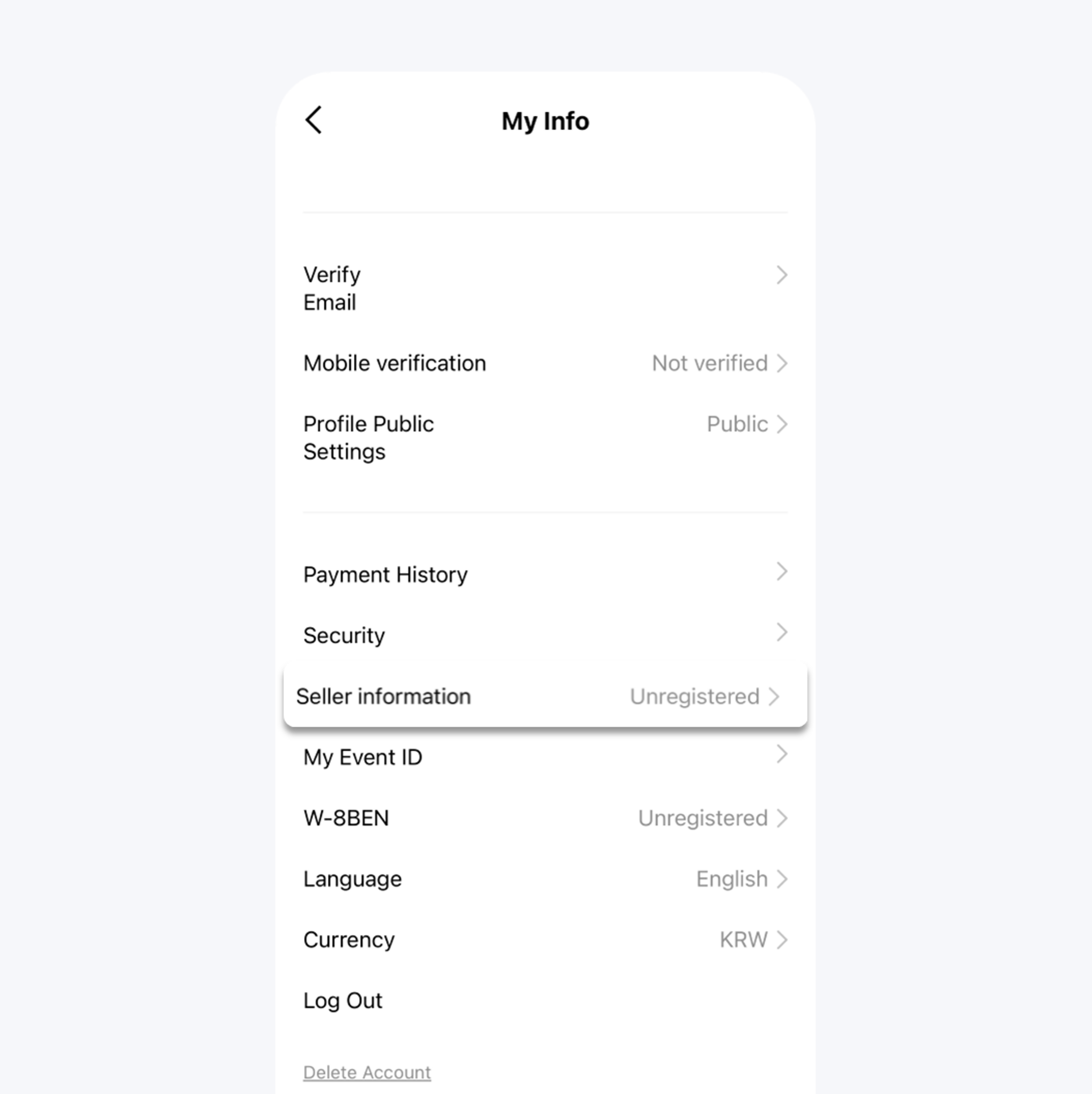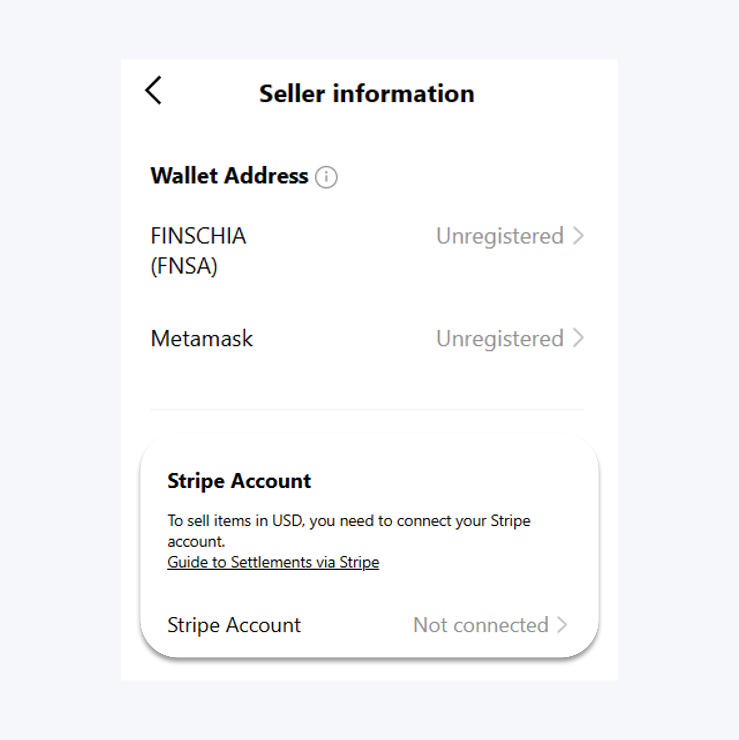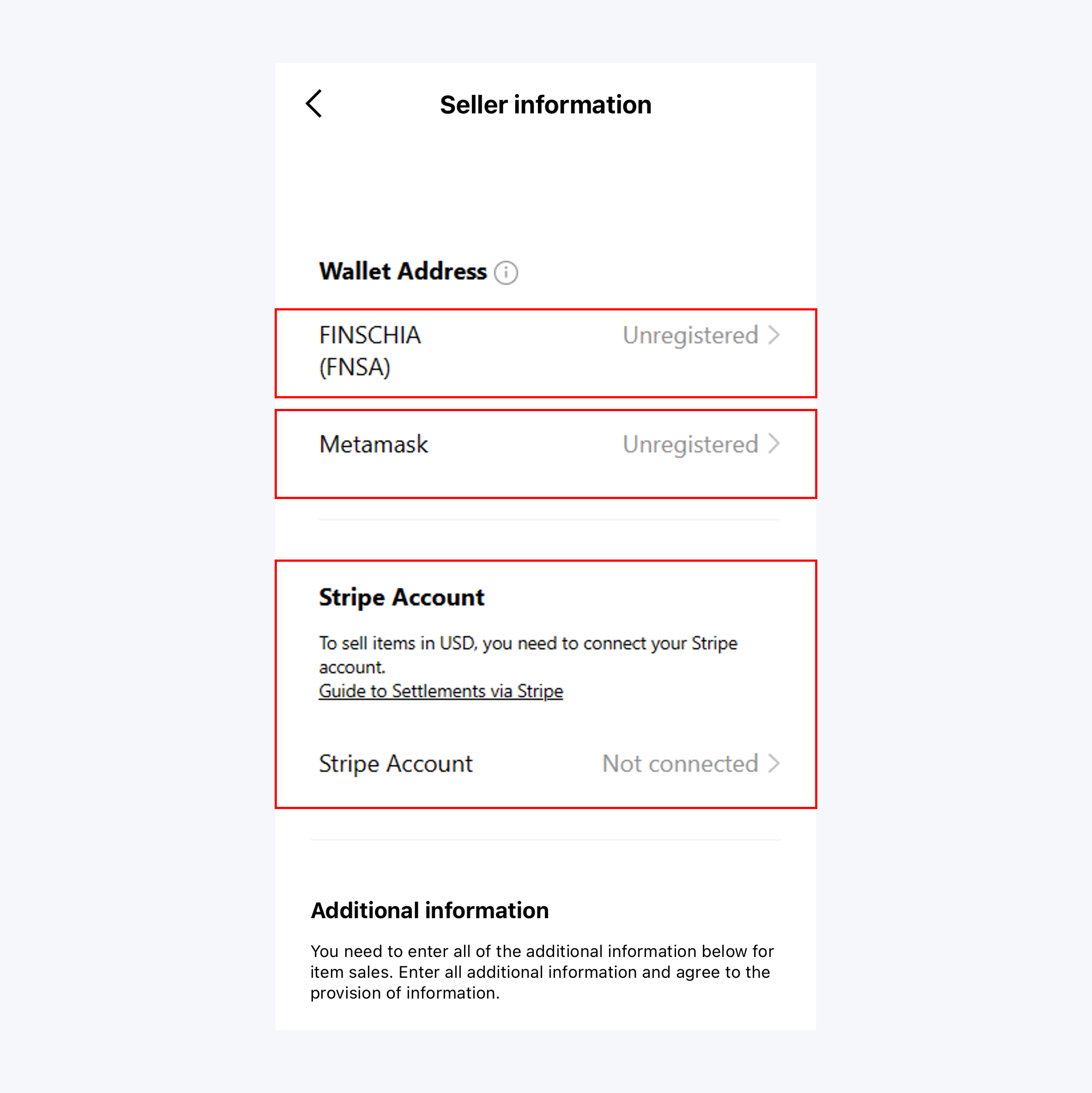 Please register seller information according to the currency (USD/FNSA/ETH) in which you want to receive the sales settlement.