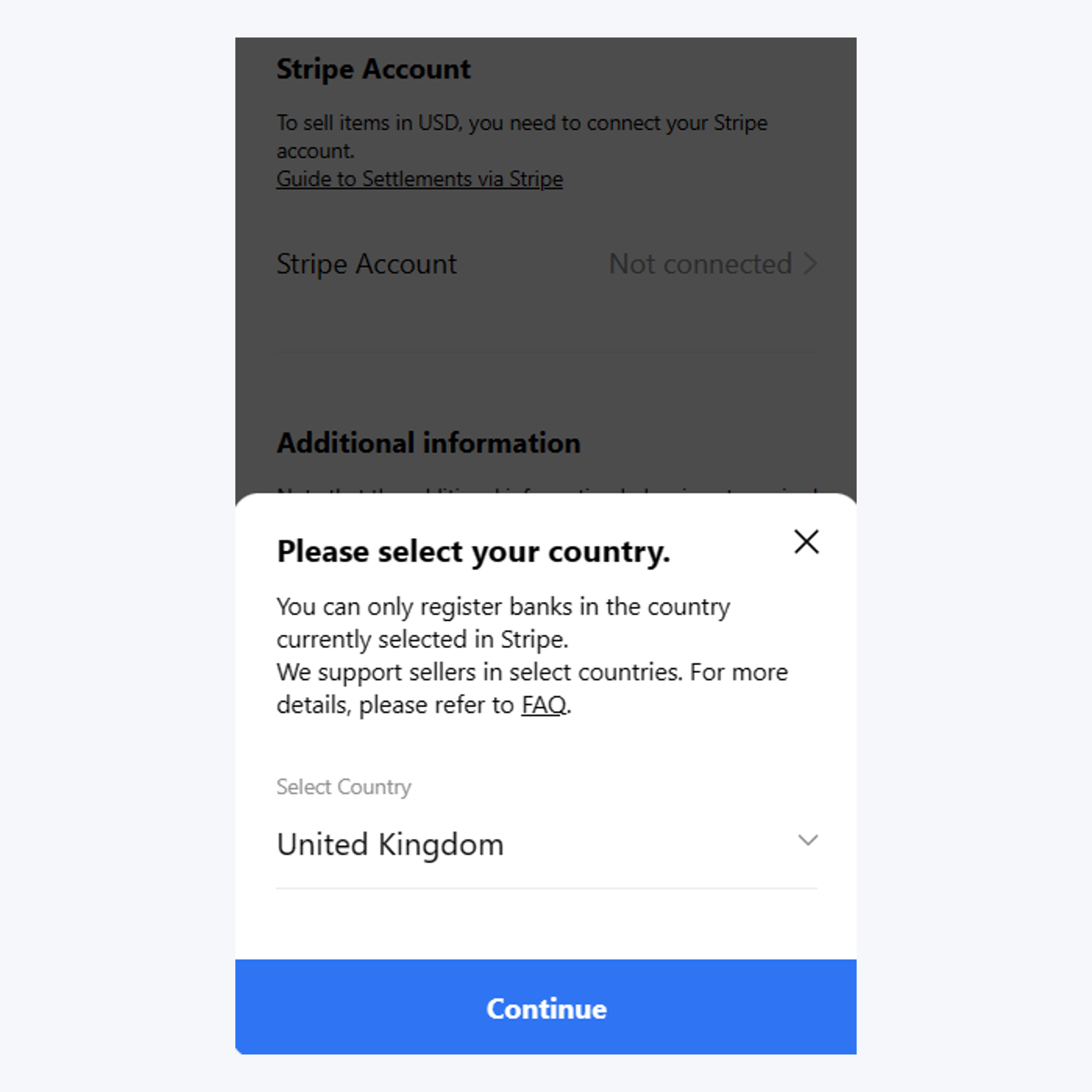 Choose your country. You can register a seller settlement account with a bank from the selected country.