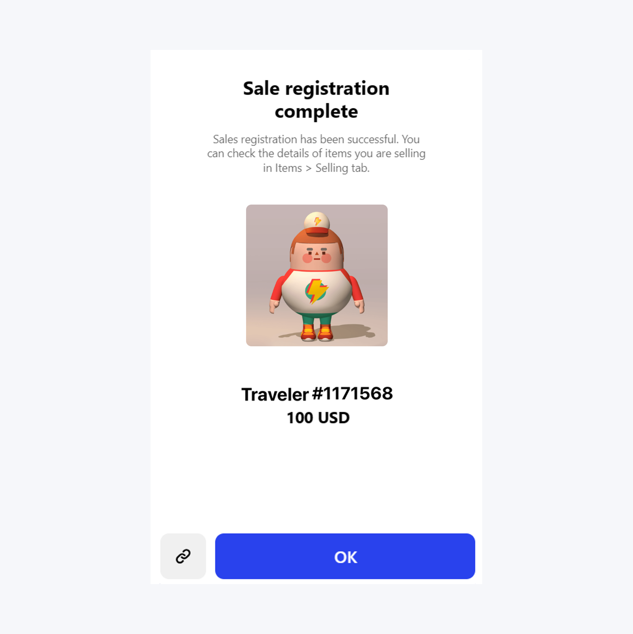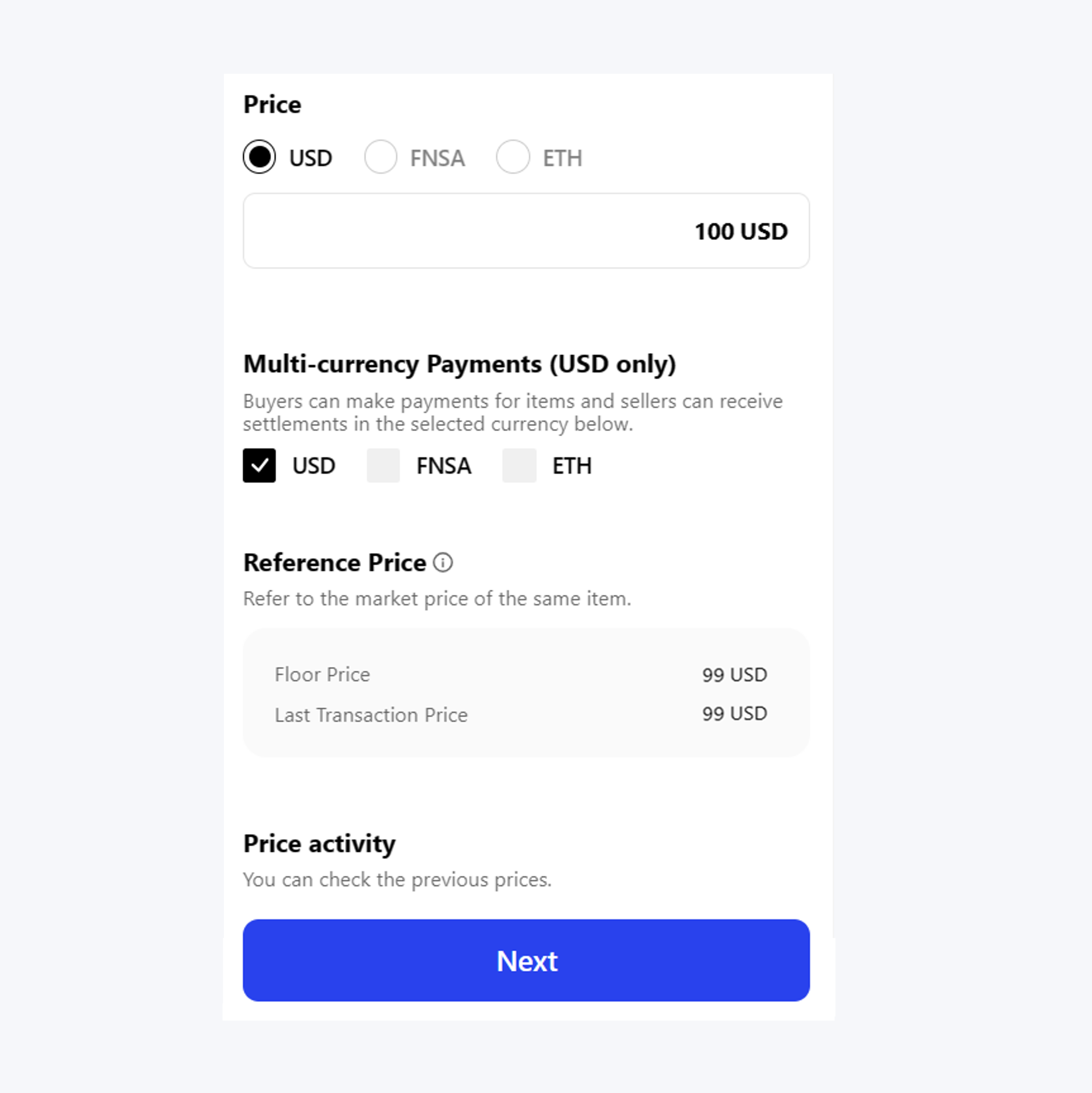 Registration for sale is complete. The items registered for sale can be viewed in 'My Items - On sale'. Once the sale is complete, the sales settlements will be deposited into your registered Wallet Address(FNSA/ETH) or Stripe settlement account!